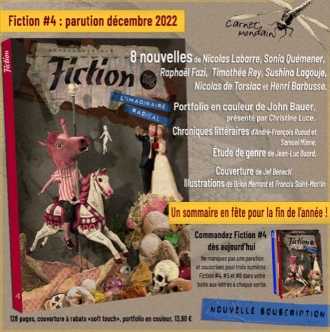 Nous avons récemment évoqué ici le renouveau de la mythique revue Fiction que les éditions du Mouton électrique ont repris sous son aile. Le n° 4 est près de sortir, avec à son sommaire pas moins de huit nouvelles, où il est question de jeu en ligne international, de bibliothèque du futur, de kaïju, de barbare, de vampire, de secret de la Commune et d’histoires qui déraillent, avec les plumes de Nicolas Labarre, Sonia Quémener, Raphaël Fazi, Timothée Rey, Sushina Lagouje, Nicolas de Torsiac, et l’imprévisible Henri Barbusse. On y lira aussi les chroniques personnelles d’André-François Ruaud, amateur éclectique de publications, et celles d’un dévoreur gourmet de littérature de l’imaginaire, Samuel Minne. Du côté des belles images, commençant par le collage de couverture créé par Jef Benech’, Francis Saint-Martin nous offre son interprétation oldschool des aventures de Fiction et Brian Merrant y assouvit sa fringale de kaïju. Quant au portfolio, il nous invite à découvrir l’immense talent illustrateur de John Bauer, en texte, en photos et en dessins, esquisses et tableaux.