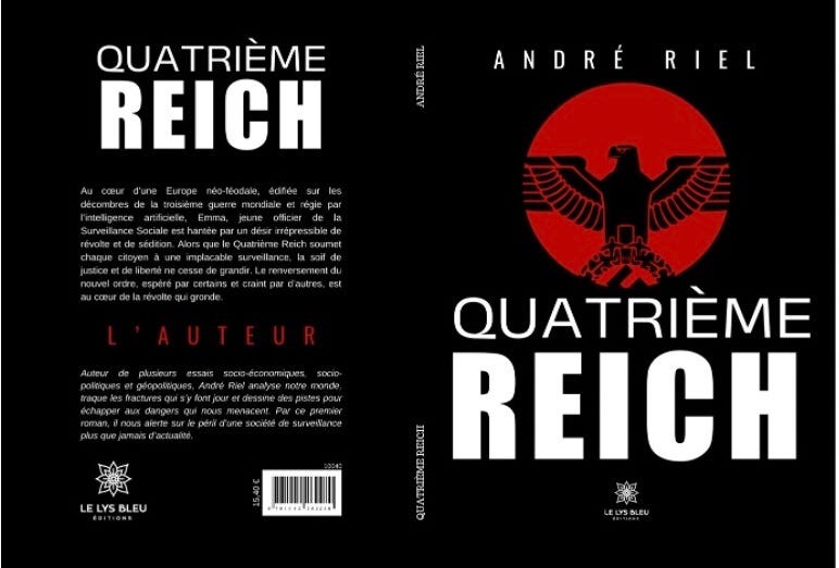 Nos News ne sont pas destinées qu’à rendre compte de la production des vedettes du genre, mais également à sortir du panier ce qu’on va appeler, sans aucune réserve, les «petites productions», pas toujours facile à trouver dans les librairies. Ainsi de Quatrième Reich, premier (court) roman signé André Riel, un essayiste versé dans l’économie et qui, suite à la troisième guerre mondiale qu’il fait démarrer après l’invasion de l’Ukraine par les russes (Brrr…), trace la géographie politique d’un nouvel empire néo-féodal qu’il appelle aussi Confédération carolingienne, où la surveillance tous azimuts faut loi (c’est même le thème principal du récit), avec comme personnage principal Emma, une femme-flic qui va peu à peu prendre conscience et intégrer la révolte qui couve. Du classique un peu sage, et ce n’est pas faire injure à l’auteur que dire qu’il est quand même loin de Leiber (À l’aube des ténèbres), mais c’est quand même un bon début (Le Lys bleu).