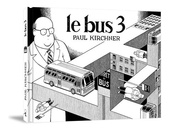 Se Souvient-on de Paul Kirchner, auteur de Dope Rider, ce western fantasmagorique qui laisserait Tarantino sur le tapis ? Nous en avons bien sûr parlé ici, de même que de la série Le Bus, que ce farceur a créé en 1979 et dont les strips ont été réunis en deux albums, plus un troisième qui lui vaut son retour ici. Qu’est-ce que ce bus ? D’abord un engin bien réel que General Motors créa en 1959, et qui impressionna si fort Kirchner qu’il lui a servi de modèle pour les aventures de son petit bonhomme tout rond, imper, chauve et lunettes, qui ne fait que l’attendre interminablement, planté devant le panneau Arrêt du bus. Et quand il parvient à y monter… eh bien c’est le sujet de ses pages format à l’italienne (16, 5 x 23), découpées en 6 ou 8 cases, et se terminant par une chute, réelle ou pas. Exemple ? Une vieille dame tricote à côté de lui, tant et si bien que c’est lui entier qui lui sert de laine. Un autre ? Notre bonhomme assis dans le bus croit voir un paysage urbain défiler devant sa fenêtre, alors qu’en réalité le bus est à l’arrêt, le conducteur déroulant mécaniquement un décor peint. C’est donc entre l’absurde et le surréalisme qu’il faut goûter les 54 gags sans parole (dont il est juste de dire que certains tombent un peu à plat) en autant de planches, en noir et blanc bien entendu, formant ce Bus 3, à garder ou à offrir (Tanibis).
