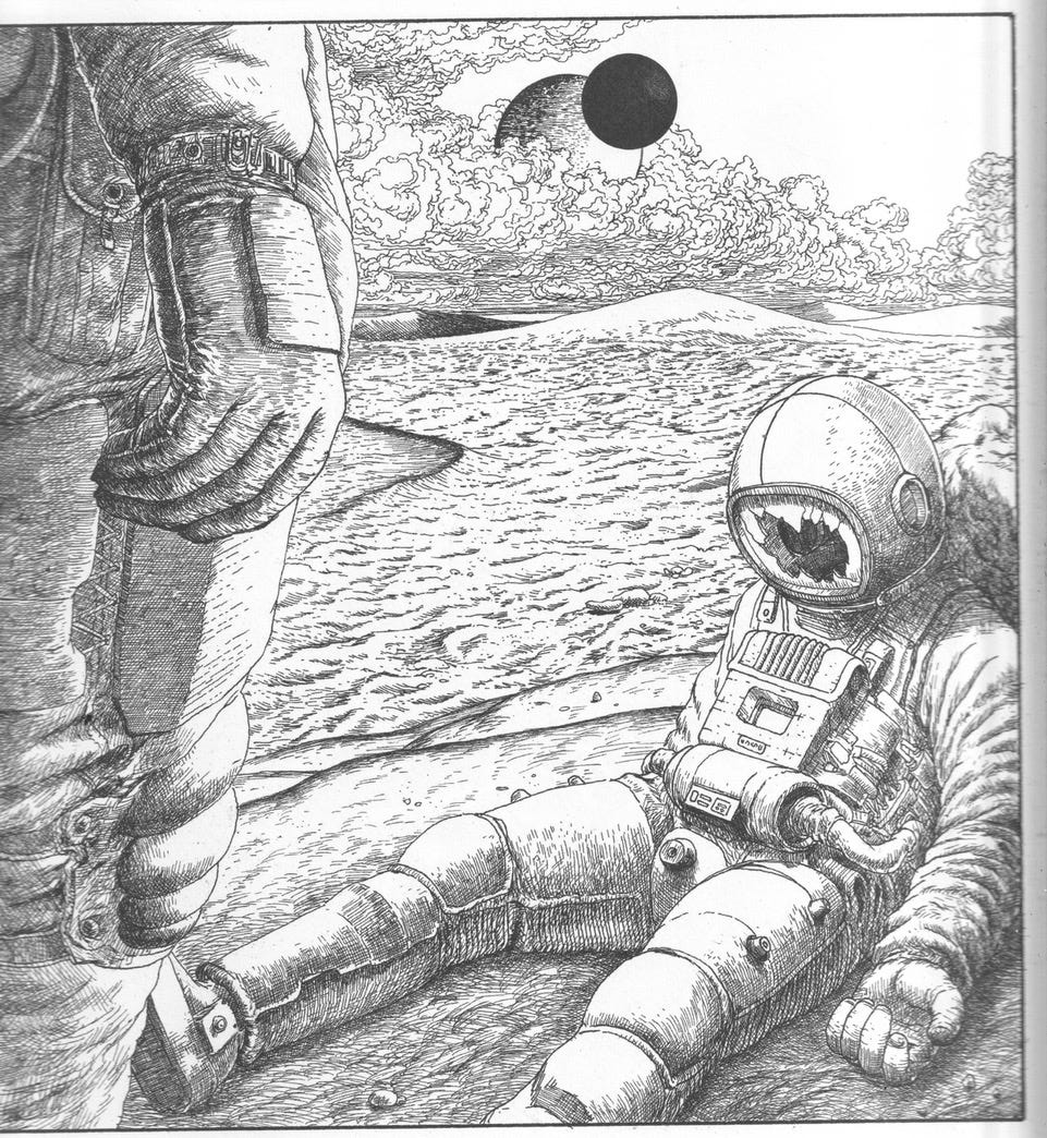 Quels rapports entre l’album ci-dessus et Cometa, première publication du français Élie Huault ? Ils sont tous deux en noir et blanc avec dessins au trait, et tous deux intégralement muets. La différence tient à ce que ce dernier est de la pure sf, puisqu’on y voit un pilote spatial sortir de l’hibernation alors que son vaisseau arrive en vue de la planète Xo, pour tenter d’y récupérer «l’entité dite artefact» – là où plusieurs expéditions précédentes ont échoué, et dont ce nouvel explorateur dont on ne voit jamais le visage (il est toujours en scaphandre) va retrouver les cadavres. La planète à parcourir en tous sens est déserte, mais parait vivante, le chercheur se perdant dans des marées noires, des tunnels sans fin, de la matière gluante, des éruptions, ce que le graphiste aborde soit en pleines pages, soit en découpage serré, avec son style réaliste correct mais manquant quelque peu de finesse – on est tout de même loin de Moebius. Au total une balade vite lue, sans déplaisir mais qu’on aura vite oubliée (Les Humanoïdes associés).